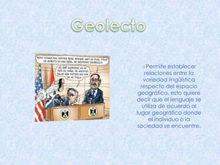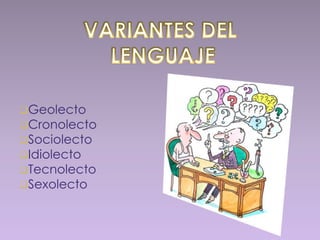 Este documento describe diferentes variantes del lenguaje, incluyendo geolectos (variedades geográficas), cronolectos (variedades históricas), sociolectos (variedades socioculturales), idiolectos (variedades individuales), tecnolectos (variedades profesionales) y sexolectos (variedades de género). Cada variante se define brevemente por su relación con un factor como la ubicación, el tiempo, la sociedad, el individuo, la profesión u otros.