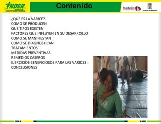 Este documento describe las varices, incluyendo su definición, causas, tipos, síntomas, diagnóstico y tratamientos. Las varices son dilataciones venosas causadas por el mal funcionamiento de las válvulas venosas que permiten que la sangre fluya hacia el corazón. Pueden ser causadas por factores como la obesidad, el sedentarismo y trabajos prolongados de pie. Los tratamientos incluyen cirugía, escleroterapia, láser, termocoagulación y medidas médicas, físicas y preventivas
