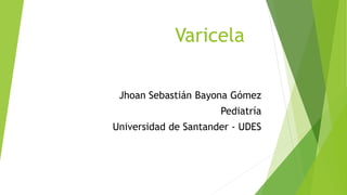 El documento resume la varicela, una enfermedad causada por el virus de la varicela-zoster que generalmente infecta a los niños. La infección primaria causa varicela y luego una infección latente de por vida, mientras que la reactivación de la infección latente causa herpes zoster. La varicela es altamente contagiosa y se transmite a través de secreciones orales o lesiones cutáneas. Los síntomas incluyen fiebre, malestar y una erupción cutánea pruriginosa que evoluciona