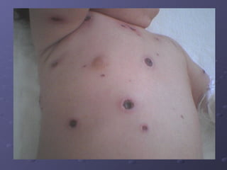 La varicela es causada por un virus del herpes que se inactiva con la luz solar y ultravioleta. Se presenta principalmente en la infancia como una erupción cutánea con vesículas que evolucionan a costras en 8-12 días, aunque puede ocurrir a cualquier edad. Las complicaciones más graves incluyen neumonía, encefalitis y síndrome de Reye. El diagnóstico es clínico y el tratamiento con aciclovir se recomienda solo para pacientes de alto riesgo. La vacuna viva atenuada y la in