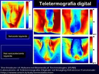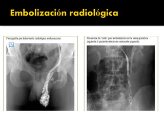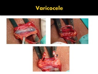 El documento resume el tema del varicocele, que es la dilatación y tortuosidad del plexo pampiniforme debido al reflujo sanguíneo en las venas testiculares. Explica que el varicocele se localiza mayormente en el lado izquierdo y puede causar esterilidad. Describe los síntomas, grados y métodos de diagnóstico como ecografía y doppler. Finalmente, cubre las opciones de tratamiento como el uso de suspensorios, embolización o varicocelectomía quirúrgica.