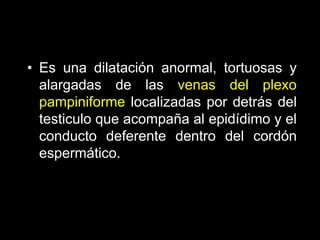 El varicocele es una dilatación anormal de las venas del plexo pampiniforme localizadas detrás del testículo. Es la causa más común de infertilidad masculina, afectando al 21-39% de los hombres. Generalmente es asintomático pero puede causar pesadez escrotal. El diagnóstico se realiza mediante ultrasonido Doppler que muestra dilatación venosa mayor a 2-3 mm que aumenta con la maniobra de Valsalva. El tratamiento principal es la ligadura de la vena espermática interna.