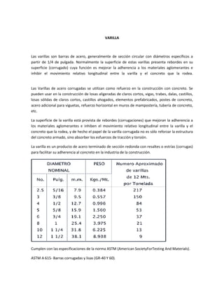 Este documento describe los diferentes tipos y usos de varillas de acero para refuerzo de concreto. Explica que las varillas son barras de acero corrugadas que se utilizan comúnmente para mejorar la resistencia del concreto en elementos como losas, vigas, columnas y cimientos. También detalla las normas ASTM que rigen las especificaciones técnicas de las varillas y proporciona información sobre sus diámetros nominales, resistencias mecánicas y aplicaciones más comunes.