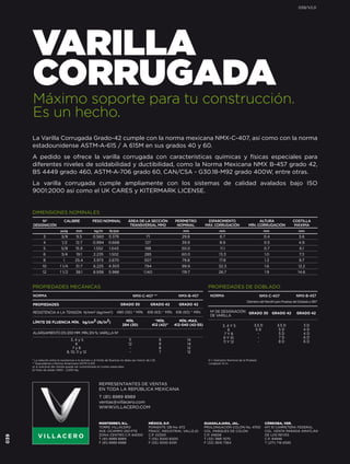 Este documento proporciona información sobre varilla corrugada producida por Villacero. Describe que la varilla cumple con normas mexicanas y estadounidenses, y que puede ser producida con características especiales según los requerimientos del cliente. También detalla las especificaciones técnicas de diámetros y grados disponibles de acuerdo a las normas correspondientes.
