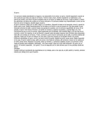 dio cuenta de que traía una nota en el hocico. Tomó la nota y leyó: ¿Podría mandarme 12 salchichas y una