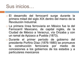 El documento describe la historia y estado actual de los sistemas ferroviarios en México y en el mundo. Explica que los ferrocarriles surgieron durante la revolución industrial en el siglo XIX y que la primera línea ferroviaria en México se construyó en 1873. Ahora, los ferrocarriles se usan principalmente para transportar carga a gran escala de manera eficiente. La red ferroviaria global conecta países y continentes.