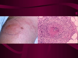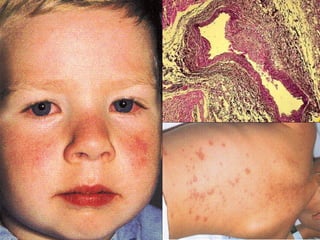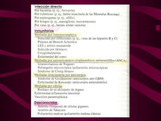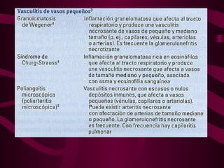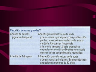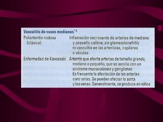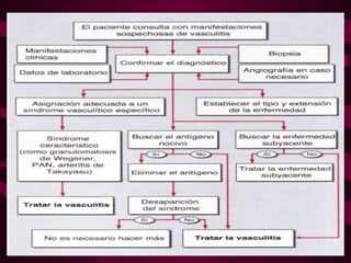 La vasculitis se caracteriza por inflamación y lesión de los vasos sanguíneos. Puede ser focal, afectando un solo órgano, o sistémica, con necrosis multifocal. El diagnóstico requiere biopsia del tejido afectado o angiografía. Los tratamientos incluyen glucocorticoides e inmunosupresores como ciclofosfamida.
