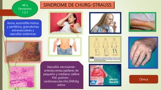 Este documento resume varios tipos de vasculitis, incluyendo el síndrome de Churg-Strauss, la poliarteritis nodosa, la arteritis de células gigantes y la polimialgia reumática. Describe los síntomas clínicos, los hallazgos de laboratorio, el diagnóstico y el tratamiento para cada una. También cubre otras vasculitis como la enfermedad de Behçet, la vasculitis crioglobulinemica y las vasculitis secundarias a fármacos u otras enfermedades.
