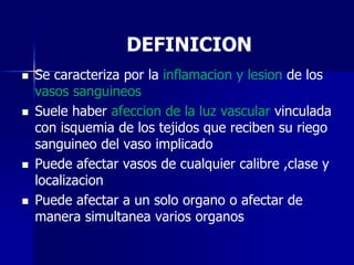 Este documento define la vasculitis, clasifica diferentes tipos de vasculitis primarias y secundarias, y describe la fisiopatología, diagnóstico y tratamiento de algunas vasculitis específicas como la granulomatosis de Wegener, el síndrome de Churg-Strauss, la panarteritis nudosa y la purpura de Schönlein-Henoch. La vasculitis se caracteriza por la inflamación y lesión de los vasos sanguíneos que puede afectar múltiples órganos. El diagnóstico definitivo requi