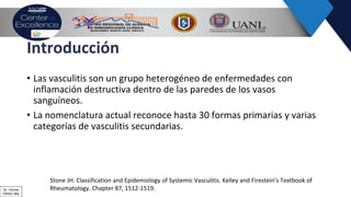Este documento describe tres tipos de vasculitis de grandes vasos: arteritis de células gigantes, arteritis de Takayasu y poliarteritis nodosa. La arteritis de células gigantes es la vasculitis sistémica más común en adultos mayores de 50 años y afecta principalmente las arterias extracraneales. La arteritis de Takayasu afecta principalmente la aorta y sus ramas principales y es más común en Asia. La poliarteritis nodosa se define como inflamación multifocal de vasos de mediano y pequeño calibre.