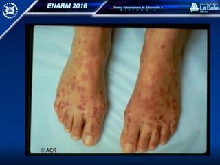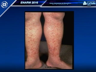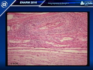 Este documento proporciona una definición y clasificación de las vasculitis, enfermedades caracterizadas por inflamación vascular. Describe los síntomas, exámenes de diagnóstico y tratamientos para diferentes tipos de vasculitis como la arteritis de células gigantes, la arteritis de Takayasu, la granulomatosis de Wegener y la poliangitis microscópica. El documento también cubre la etiopatogenia, identificación y exámenes de laboratorio relevantes para las vasculitis.