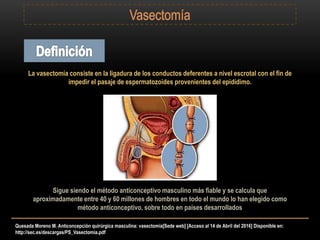 La vasectomía es el método anticonceptivo quirúrgico masculino más efectivo, en el que se ligan y bloquean los conductos deferentes para prevenir el paso de espermatozoides. Se estima que entre el 40-60% de hombres en el mundo han elegido este método. La vasectomía tiene una tasa de fallo menor al 1% y es reversible aunque el proceso de reversión es complejo y el éxito depende de varios factores.