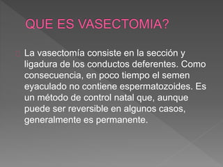 La vasectomía es un procedimiento quirúrgico para control de natalidad que consiste en la sección y ligadura de los conductos deferentes, lo que evita que el semen contenga espermatozoides. Aunque a veces es reversible, generalmente es un método permanente. Después de la operación se debe usar otro método anticonceptivo temporalmente hasta que las pruebas confirmen la ausencia de espermatozoides. La vasectomía no afecta la erección, la libido o las relaciones sexuales, pero puede ocasionar efectos secundarios a cort