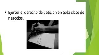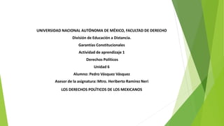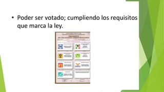 Este documento trata sobre los derechos políticos de los ciudadanos mexicanos. Explica que los derechos políticos incluyen el derecho a votar, asociarse libremente y participar en decisiones políticas. También cubre las obligaciones de los ciudadanos como pagar impuestos y votar. Finalmente, asigna al estudiante la tarea de investigar y presentar sobre los derechos políticos en la constitución mexicana y tratados internacionales.