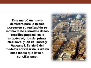 El Concilio Vaticano II marcó un nuevo rumbo para la Iglesia al referirse a modelos conciliares del pasado. Tuvo como objetivos promover el desarrollo de la fe, la renovación moral de los fieles y adaptar la disciplina eclesiástica a los tiempos modernos. Se desarrolló en cuatro sesiones entre 1962 y 1965 bajo los papados de Juan XXIII y Pablo VI, y produjo constituciones, decretos y declaraciones que promovieron la renovación litúrgica, una nueva comprensión del papel de los obis