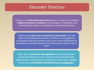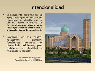 El documento propone que las escuelas católicas promuevan procesos de discipulado misionero para fortalecer su identidad y misión a la luz de las enseñanzas de la Conferencia de Aparecida. Reconoce los desafíos del cambio de época y propone actualizar la misión educativa mediante una renovada misión continental permanente para formar discípulos misioneros de Jesucristo. Asimismo, enfatiza la importancia de un currículum evangelizador e involucrar a todos los actores educativos como
