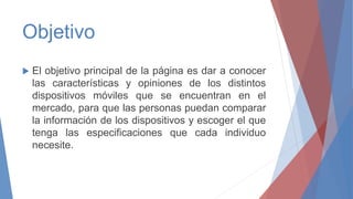 El documento presenta la página web www.mastertechinfo.16mb.com, cuyo objetivo es dar a conocer las características y opiniones de distintos dispositivos móviles para que las personas puedan comparar la información y elegir el que mejor se ajuste a sus necesidades. La página contiene secciones como Inicio, Reviews, Galería, Tienda, Glosario y Contacto para reseñas, imágenes y especificaciones técnicas de dispositivos, así como información para contactar al autor.