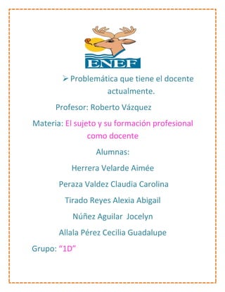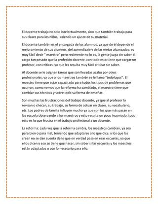 El documento describe algunas de las problemáticas que enfrentan los docentes en su trabajo. Los maestros no solo se preparan intelectualmente sino que también preparan material para sus clases y son responsables del aprendizaje y progreso de sus alumnos. Sin embargo, a menudo reciben críticas de quienes no comprenden plenamente las responsabilidades de un profesor. Además, se les asignan tareas de otros profesionales y deben adaptarse constantemente a los cambios en las reformas educativas.