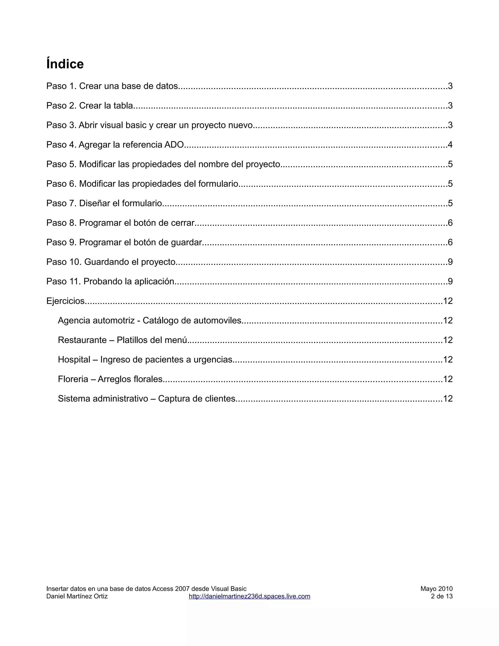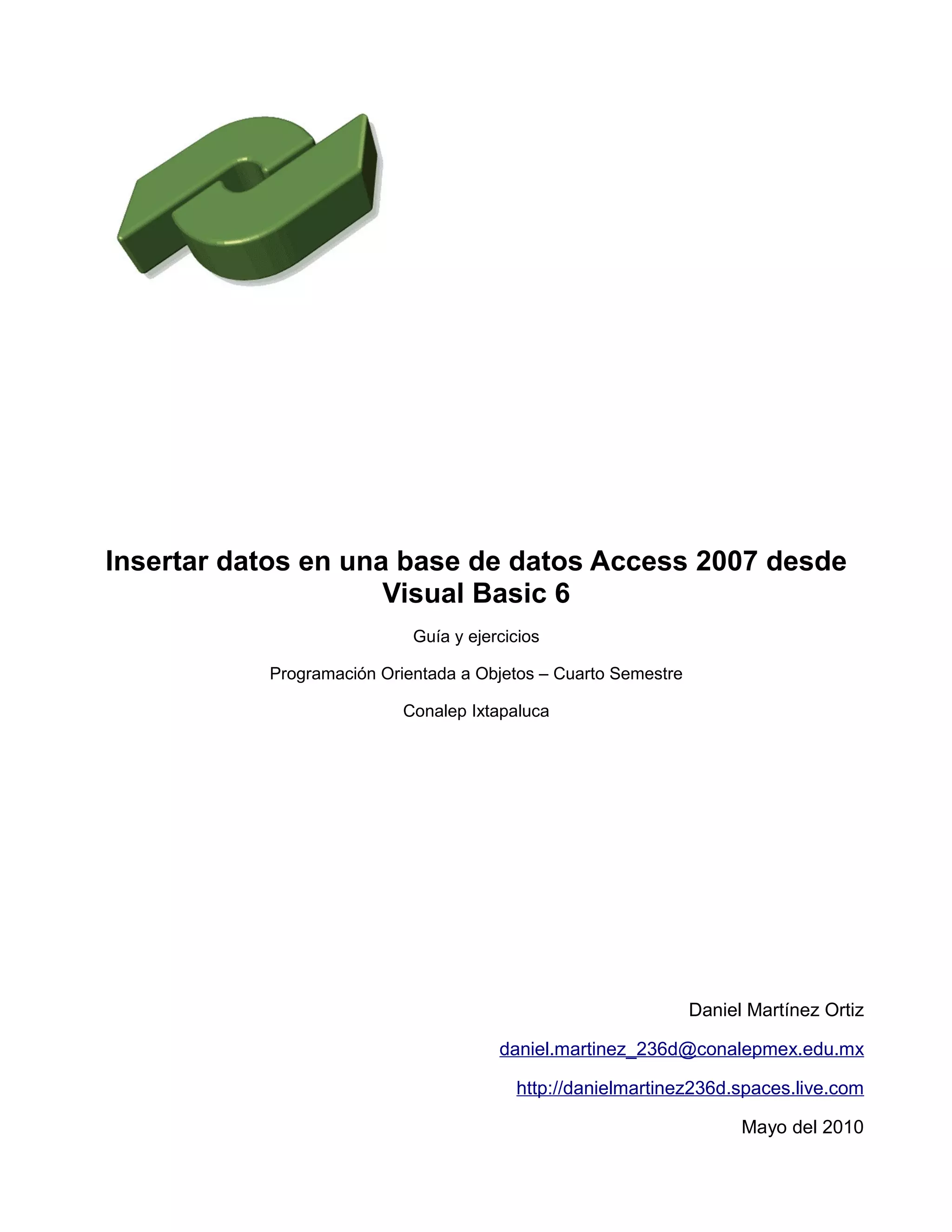 Este documento proporciona instrucciones paso a paso para insertar datos en una base de datos Access 2007 desde Visual Basic 6. Explica cómo crear una base de datos y tabla en Access, agregar la referencia ADO en Visual Basic, diseñar un formulario para capturar datos, y programar un botón para guardar la información en la tabla de Access. También incluye ejemplos de proyectos que los estudiantes pueden crear para practicar estas habilidades.
