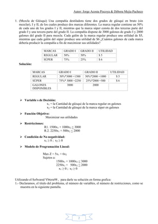 Este documento presenta 7 problemas de programación lineal resueltos por los autores Jorge Acosta Piscoya y Débora Mejía Pacheco. Cada problema contiene la descripción del problema, las variables de decisión, la función objetivo y las restricciones correspondientes. Los autores formulan cada modelo de programación lineal y proveen la solución gráfica y numérica utilizando software.