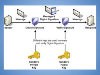 El documento describe el algoritmo de firma digital (DSA), incluyendo su historia, parámetros, funcionamiento y aplicaciones. DSA es un estándar estadounidense para firmas digitales en aplicaciones gubernamentales que se basa en la dificultad de calcular logaritmos discretos. Genera firmas digitales utilizando una llave privada y parámetros públicos para verificar la integridad de los datos firmados. Aunque es más lento que RSA, DSA es compatible con la mayoría de servidores debido a ser un estándar federal.