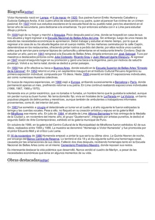 Víctor Humareda fue un pintor peruano expresionista reconocido por su creatividad. Nació en 1920 en Lampa, Puno y falleció en 1986 en Lima. Estudió en la Escuela Nacional de Bellas Artes del Perú y luego obtuvo becas para estudiar en Argentina y Europa. Entre sus obras más destacadas se encuentran Arlequín con mandolina, Pueblo Joven y Cóndores. Recibió varios premios y su obra reflejaba la melancolía y oscuridad de su vida personal.