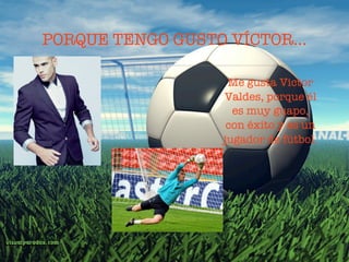El documento proporciona información sobre el jugador de fútbol español Víctor Valdés. Víctor Valdés es de Cataluña, España y ha jugado fútbol profesionalmente para el Barcelona durante los últimos 18 años. Es ágil, comandante y talentoso en el fútbol.