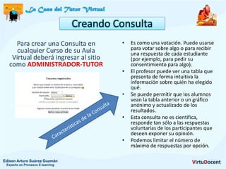 La consulta permite realizar una votación o encuesta en un curso virtual para recibir respuestas de los estudiantes de forma anónima. El profesor puede ver los resultados de la consulta en una tabla e incluso compartir un gráfico con los estudiantes. Para crear una consulta, el tutor debe ingresar como administrador, seleccionar agregar actividad y completar los campos obligatorios de nombre, descripción y opciones.