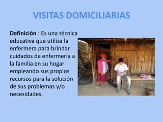 La visita domiciliaria es una técnica educativa utilizada por las enfermeras para brindar cuidados de salud a la familia en su hogar, ayudándolos a utilizar sus propios recursos para resolver problemas o necesidades. Involucra evaluar las condiciones socioeconómicas de la familia, realizar seguimientos de casos, educar sobre hábitos higiénicos y captar personas para programas de salud. El proceso incluye planificar objetivos, ejecutar cuidados directos e indirectos, y evaluar resultados para modificar el plan