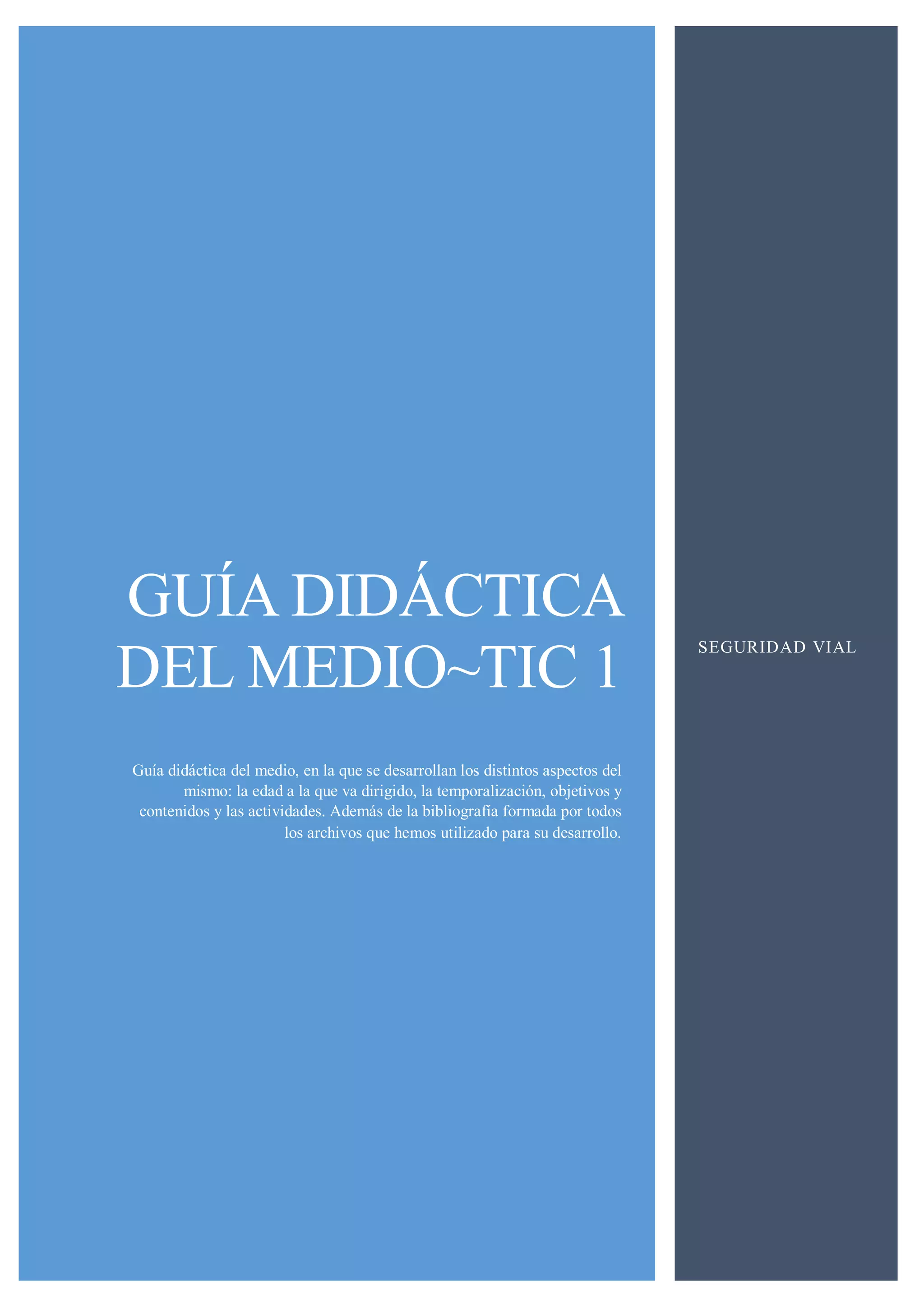 Este documento presenta una guía didáctica para un medio TIC sobre seguridad vial dirigido a niños de 4 a 5 años. La guía describe el propósito del medio, que es evaluar los objetivos y contenidos de la unidad sobre seguridad vial a través de preguntas en un video interactivo. El video presenta la historia de una niña que va al parque y hace preguntas a lo largo del camino para evaluar si los estudiantes conocen las normas para caminar por la acera, cruzar la calle, y jugar de forma