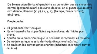 El gradiente es un vector perpendicular a las curvas de nivel en un punto y apunta en la dirección de máxima variación. Su módulo es igual a la derivada direccional máxima. Se anula en puntos estacionarios. El documento también presenta ejemplos de cálculo del gradiente y derivadas parciales de funciones.