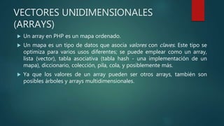 Los arrays en PHP son mapas ordenados que asocian valores con claves. Pueden usarse como listas, tablas hash, diccionarios u otras estructuras de datos. Los arrays pueden contener otros arrays, permitiendo estructuras multidimensionales. Los arrays se crean con el constructor array() y pueden ser predefinidos con índices numéricos o asociativos con claves personalizadas. Los elementos de array se acceden usando corchetes o llaves y la sintaxis array[clave].