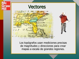 Este documento presenta los conceptos básicos de vectores. Explica que un vector contiene magnitud y dirección, mientras que una cantidad escalar solo contiene magnitud. Describe cómo encontrar los componentes de un vector a lo largo de los ejes x e y, y cómo determinar la resultante de dos o más vectores mediante la suma de sus componentes correspondientes. También cubre la notación de coordenadas polares y rectangulares para expresar vectores, así como el uso de la trigonometría para resolver problemas de vectores.