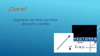 El documento aborda conceptos fundamentales sobre vectores, incluyendo dirección, sentido, magnitud y sus diferentes tipos, como vectores paralelos y colineales. Se explican las coordenadas de un vector y el vector de posición, así como las operaciones de suma, resta y multiplicación de vectores con escalares. Además, se menciona cómo las coordenadas de un vector corresponden a su representación en el plano cartesiano.