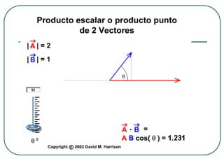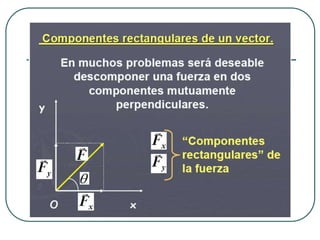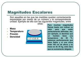 Este documento describe las magnitudes escalares y vectoriales, y las operaciones con vectores. Las magnitudes escalares se expresan mediante un número y una unidad, mientras que las magnitudes vectoriales requieren un valor numérico, dirección, sentido y punto de aplicación. Se explican los métodos gráficos y analíticos para sumar vectores, incluyendo el método del paralelogramo, poligonal, y mediante componentes rectangulares y vectores unitarios. Finalmente, se definen el producto escalar y producto vectorial de dos vectores.