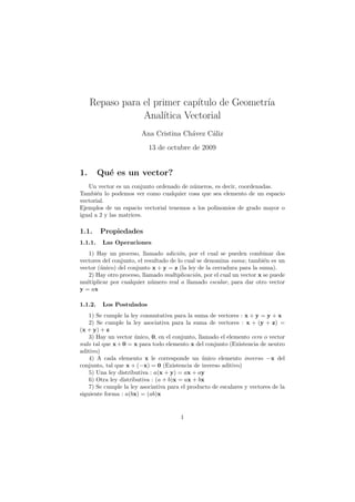 Este documento proporciona un repaso del capítulo 1 de Geometría Analítica Vectorial. Explica conceptos clave como vectores, propiedades de vectores, operaciones con vectores como suma y multiplicación por escalares, ángulos entre vectores, producto punto y producto cruz. También cubre temas como coordenadas polares, cosenos directores, triple producto escalar y triple producto vectorial.