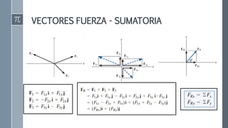 Este documento trata sobre vectores 3D. Explica conceptos como la dirección, cosenos directores y ángulos directores de un vector cartesiano, así como el módulo y unitario de un vector. También cubre la suma de vectores cartesianos y presenta ejercicios para determinar fuerzas y resultados en sistemas mecánicos tridimensionales.