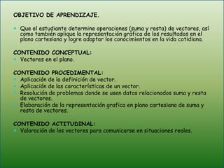La propuesta didáctica busca enseñar vectores en el plano y operaciones como suma y resta a través de representaciones gráficas usando el método del paralelogramo y triángulo. El objetivo es que los estudiantes aprendan a determinar operaciones de vectores y aplicar la representación gráfica en el plano cartesiano. Se utilizará una herramienta web interactiva para motivar a los estudiantes y mejorar la comprensión del tema.