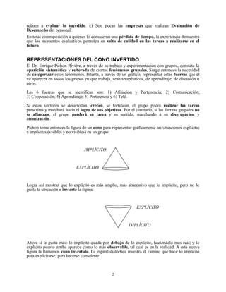 El documento presenta el concepto de "vectores del cono invertido" desarrollado por Enrique Pichon-Rivière para representar las fuerzas grupales. 1) El cono invertido grafica las situaciones explícitas e implícitas en un grupo, con lo implícito sosteniendo a lo explícito. 2) Los seis vectores que representan las fuerzas constantes en los grupos son: afiliación y pertenencia, comunicación, cooperación, aprendizaje, pertinencia y telé. 3) Estos vectores deben desarrollarse para