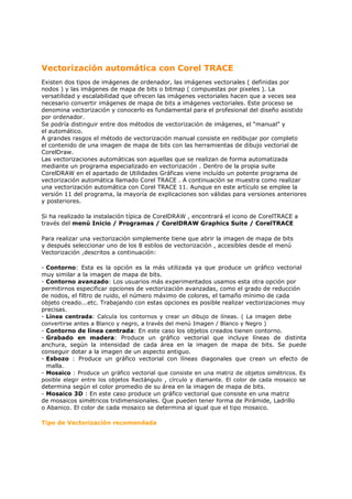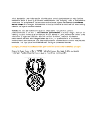 Este documento describe el proceso de vectorización automática de imágenes de mapa de bits a imágenes vectoriales utilizando el programa Corel TRACE. Explica que existen dos tipos de imágenes (vectoriales y de mapa de bits), y que la vectorización convierte imágenes de mapa de bits a vectoriales. Luego detalla los diferentes estilos de vectorización en Corel TRACE, como contorno, contorno avanzado y mosaico, y recomienda utilizar la opción de contorno avanzado en blanco y negro para lograr vectoriz