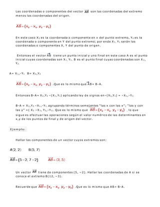 Un vector es una magnitud que tiene cantidad, dirección y sentido. Un vector posiciona un punto P en un plano de coordenadas mediante sus componentes X e Y, las cuales son las coordenadas del punto final menos las del punto de origen. El módulo de un vector es la longitud del segmento que lo define y representa su magnitud.