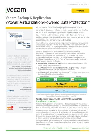 1) Veeam presenta su producto vPower, que permite ejecutar máquinas virtuales directamente desde archivos de backup para proporcionar recuperación instantánea, recuperación de elementos de aplicaciones individuales, y verificación automática de la recuperabilidad de los backups.