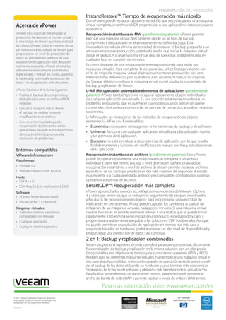2) vPower utiliza la tecnología de virtualización para ofrecer funcionalidades sin precedentes como recuperación instantánea de máquinas virtuales completas en minutos, recuperación de objetos individuales de cualquier aplicación virtualizada, y verificación automática de que todos los backups son