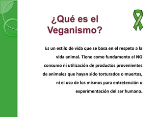 El documento describe el veganismo, que es un estilo de vida basado en el respeto a los animales que implica no consumir ni utilizar productos de origen animal. Explica las diferencias entre veganismo y vegetarianismo, y señala que el veganismo es una filosofía ética que rechaza la explotación de los animales. También resume brevemente el origen del término "vegano" y algunos de los principios del veganismo como la alimentación, la vestimenta y el rechazo al entretenimiento y experimentación con animales.