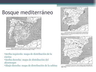 El bosque mediterráneo se caracteriza por árboles y plantas con adaptaciones para sobrevivir con poca agua, como hojas pequeñas y coriáceas y raíces profundas. Incluye especies como la encina, alcornoque y sabina, cada una adaptada a diferentes tipos de suelo y niveles de humedad. Cuando las condiciones son demasiado secas solo permanece el matorral mediterráneo, compuesto por arbustos y hierbas pequeñas como brezo, jara y tomillo.