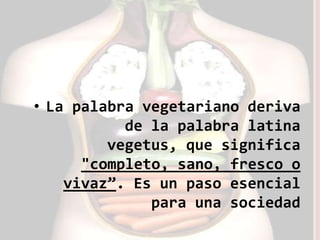 Este documento discute las razones para adoptar una dieta vegetariana, incluyendo beneficios para la salud humana y del planeta. Explica que ser vegetariano significa no comer carne y clasifica diferentes tipos de dietas vegetarianas. También argumenta que una dieta basada en plantas es más ética y sostenible que una que incluye carne.