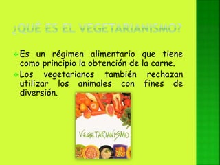 El documento habla sobre el vegetarianismo, sus tipos y razones. Las principales razones para ser vegetariano son la salud (32%), preocupaciones sobre aditivos y hormonas en la carne (15%), no gustar el sabor de la carne (13%) y querer a los animales (11%). Algunos tipos de vegetarianismo incluyen ovo-lacto vegetarianismo, ovo vegetarianismo y veganismo. Una dieta vegetariana bien planificada puede ser saludable, aunque los vegetarianos deben asegurarse de obtener suficientes nutrientes