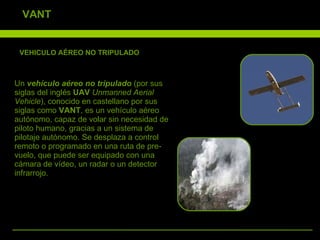 El documento proporciona información sobre vehículos aéreos no tripulados (VANT o UAV), incluyendo sus usos, componentes y referentes. Los VANT pueden usarse para misiones de observación, recopilación de muestras en ambientes peligrosos, vigilancia de fronteras y desastres naturales. Están compuestos de estaciones de control, sensores, sistemas de guiado y comunicación. El documento también describe varios modelos de VANT desarrollados en Chile e internacionalmente.