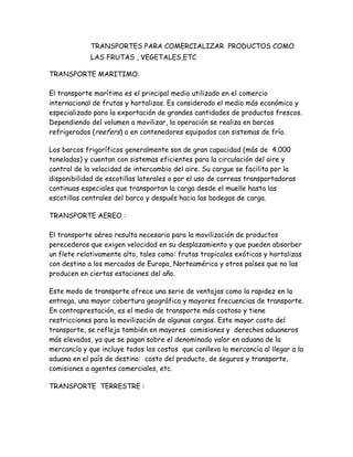El documento describe los diferentes medios de transporte para productos hortofrutícolas, incluyendo el transporte marítimo, aéreo, terrestre e internacional. Cada modo de transporte tiene ventajas y desventajas dependiendo del tiempo, distancia, volumen y tipo de producto. El transporte marítimo es el más económico para grandes volúmenes, mientras que el aéreo es más rápido pero costoso. El documento también explica los principios básicos del transporte de estos productos perecederos.