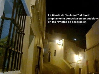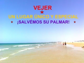 El documento describe varios lugares y características del pueblo de Vejer, en España. Menciona lugares como la tienda de Juana, el bar Trafalgar, la Parroquia de Vejer, la puerta de la Segur, La Corredera y su torre, la plaza moruna, y el pub Yoplis. También incluye fotos de personas, paisajes, y actividades musicales que tienen lugar en Vejer, resaltando su belleza y ambiente único. Finalmente, proporciona un enlace para firmar una petición para salvar el palmar de Vejer